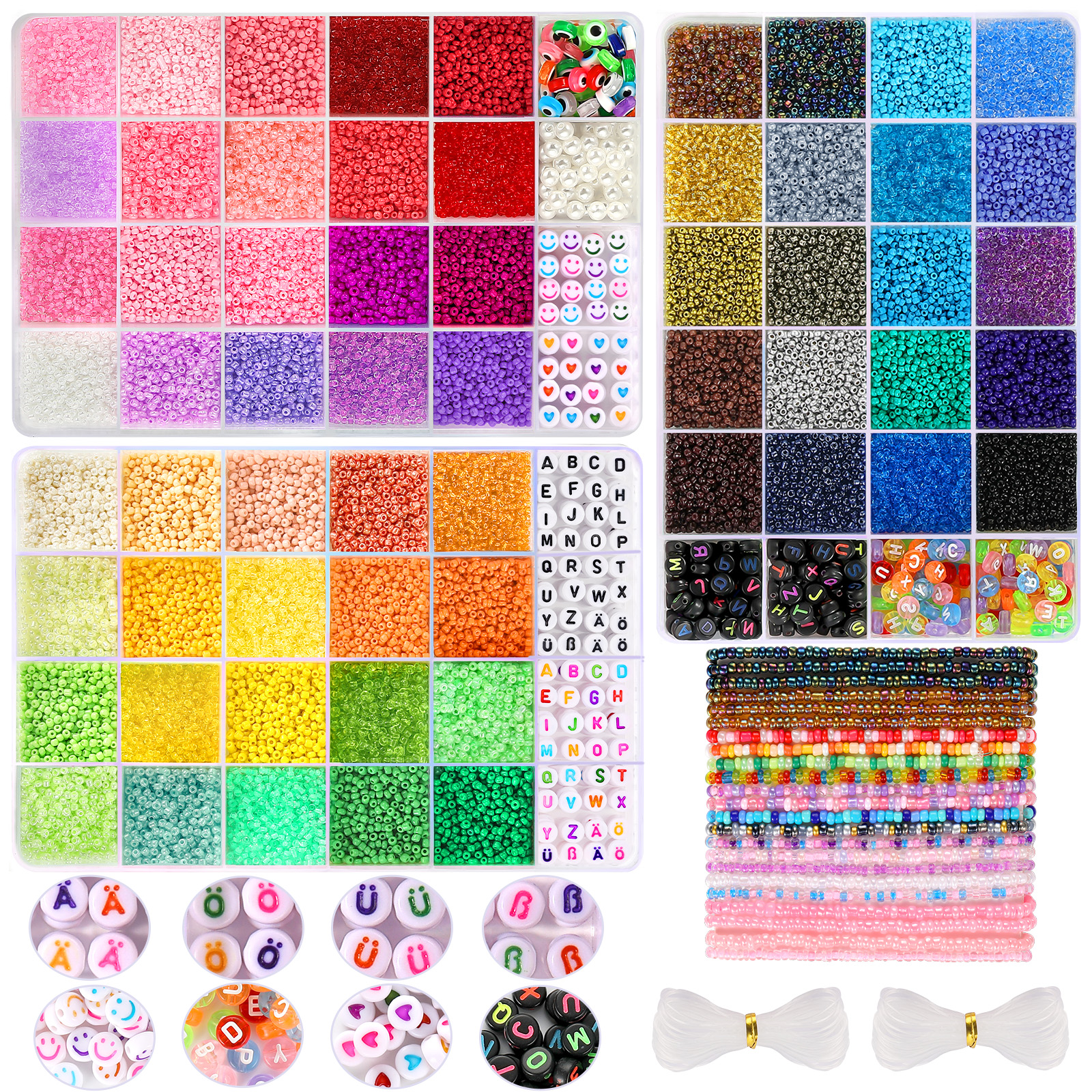 A total of 3 boxes beads of jewelry making kit, including 36000 pcs 2mm seed beads, 400 pcs letter beads, 50pcs evil eye beads, 50pcs pearl beads(25pcs 4mm + 25pcs 6mm), 50pcs smile face beads, 50 pcs heart beads and 4 rolls 0.5mm elastic string (Length of each roll is 15m/49ft).